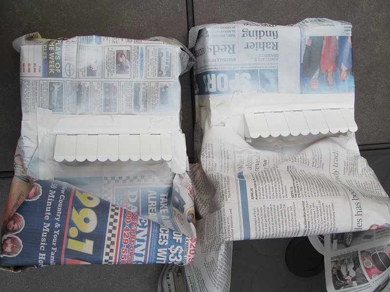 As reported in Part One of this series, our building repair, refurbishment, touchup, etc., started in early spring. Still, there's always something left to do. For example, the Playskool stores that I trashbashed needed their awnings painted. I could have brush-painted them, but I prefer the durability and smoothness of spray paint. Using masking tape and lots of newspaper, I masked off everything but the awnings, then gave them two coats of white.