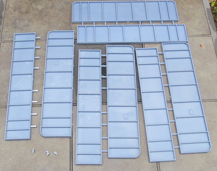 After I snapped the pieces apart, I wiped them clean with Fantastic, and made sure to wipe all the residue off. This removes the mold-release agent from the manufacturing processes and makes certain no greasy fingerprints will keep the paint from sticking. In the photo, you can also see the "stone texture" paint I bought to spray on the upright 4"x4" posts.