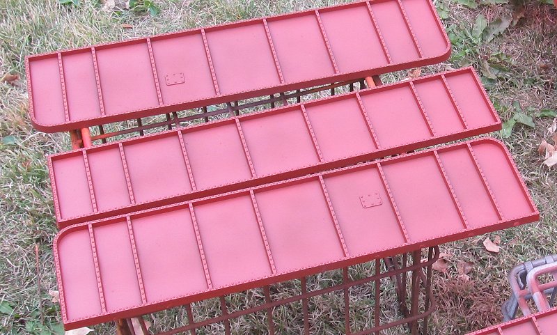 As it turned out, it was almost too cool and windy to spray paint. Again, it was October and I was prepping for a November open house, so this time of year you work with what you have. The photo to the right shows the backs being painted first. Red primer is always useful in this sort of endeavor.